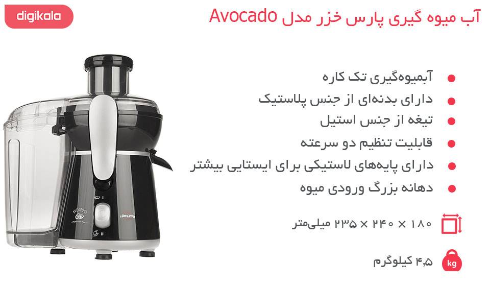 در خرید دستگاه آب‌میوه‌گیری باید به نکاتی مثل جنس دستگاه و تیغه‌ها، توان مصرفی و تک‌کاره و چندکاره‌بودن توجه کرد. ظاهر دستگاه و زیبایی آن برای برخی در اولویت قرار دارد؛ اما برای برخی دیگر کارایی همیشه حرف اول را می‌زند. آب‌میوه‌گیری «پارس خزر» مدل «Avocado» یک آب‌میوه‌گیری تک‌کاره است که از کالاهای میان‌رده و خوش‌ساخت تولیدشده‌ی پارس خزر تا به امروز محسوب می‌شود. این آب‌میوه‌گیری هم ظاهر زیبا و هم کارایی خوبی دارد. پوشش بدنه‌ی این دستگاه از پلاستیک است. پایه‌های لاستیکی چسبان ضدلغزش زیر بدنه‌ی آن نصب شده است تا حین فعالیت، لرزش و جابه‌جایی دستگاه به حداقل برسد و خطری بروز نکند. به کمک سیم‌جم‌کن این کالا که در قسمت پایینی آن قرار گرفته است، می‌توانید سیم دستگاه را جمع کرده و خیالتان بابت سالم ماندن‌ آن راحت باشد.