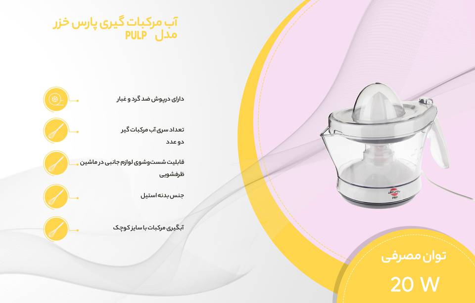 آب مرکبات گیری «پارس خزر» (Pars Khazar) مدل PULP، ساده، ارزان، سبک و درعین‌حال، بسیار کاربردی طراحی‌شده است. این آب مرکبات گیری تک‌کاره، با گنجایش مخزن آبمیوه گیری 0.6 لیتر به همراه فیلتر قابل شستشو طراحی و ساخته‌شده است. همچنین توان مصرفی این محصول به 20 وات و طول سیم برق‌اش به 1.2 متر می‌رسد. از دیگر مشخصات کلی این محصول می‌توان به سری مخصوص جهت آبگیری مرکبات در اندازه بزرگ، دارای سری اضافی جهت آبگیری لیموترش، دارای قطعات جداشدنی و قابل شستشو در ماشین ظرف‌شویی، قابلیت تعیین درجه لرت میوه در 5 وضعیت، قابلیت شروع به کار خودکار محصول، قابلیت چرخش موتور محصول در دو جهت برای آبگیری بهتر، مجهز به 3 پایه لاستیکی ضد لرزش در کف محصول و دارای کاور پلاستیکی شفاف محفظه آب مرکبات گیر جهت جلوگیری از نشستن گردوغبار اشاره کرد. در نظر داشته باشید که پارس خزر، یک شرکت بزرگی ایرانی است که از سال 1347 با همکاری شرکت توشیبا ژاپن، آغاز به کار کرده است. این شرکت در زمینه‌های ساخت لوازم‌خانگی، فعالیت‌های گسترده‌ای را در کشور انجام می‌دهد.