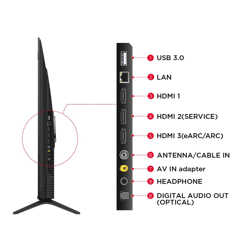 تلویزیون 55 اینچ TCL مدل 55C655 از نظر اتصالات کاملاً کامل است و طیف وسیعی از دستگاه‌ها را پشتیبانی می‌کند: