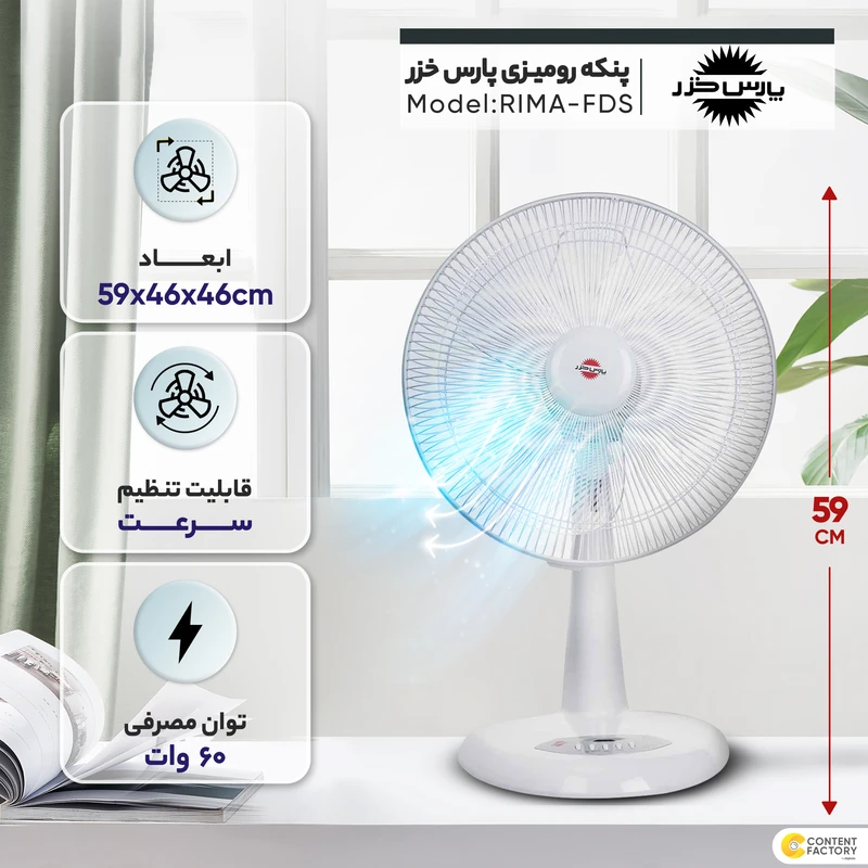 این نوع کالای سرمایشی قابلیت قرار گیری در اتاق‌های متوسط با ابعاد زیر صد متر را دارد و حجم باددهی بالا تا 56 متر مکعب در دقیقه می‌تواند خنکی ایده‌آلی را در محیط ایجاد کند. با این حال لازم است بدانید که سری این کالا تنها به چپ و راست به شکل افقی می‌چرخد و امکان گردش عمودی و تناوبی را ندارد. یکی از مزایای قابل توجه این محصول عملکرد کم صدا و بدون لرزش آن همراه با امکان تغییر سرعت پنکه در سه حالت تند، متوسط و کند است. این پنکه‌ی چهار پره از جمله میان‌رده‌های پرفروش بازار است که از ریموت کنترل و تایمر بهره‌ای نبرده است. بنابراین می‌توان آن را یک پنکه‌ی رومیزی سنتی نامید. استفاده از پلاستیک فشرده و باکیفیت در ساخت بدنه‌ی این وسیله‌ی سرمایشی یکی از مزایای قابل توجه در آن به شمار می‌رود که همراه با پایه‌ای محکم و حرفه‌ای از لرزش آن در زمان کار یا افتادن پنکه بر روی زمین جلوگیری می‌کند. پنکه پارس خزر مدل RIMA-FDS کالایی با بدنه‌ی بادوام و پایه‌دار است که وزنی سبک دارد و با ایتفاده از برق شهری کار می‌کند. حجم باددهی و قدرت گردش هوای این محصول بسیار ایدئال است و می‌تواند تا 56 متر مکعب در دقیقه باددهی داشته باشد، البته تمام این مزایا در کنار عملکرد کم صدای پنکه از ارزش چند برابری برخوردار می‌شود. با این حال کالای پیش روی شما ریموت کنترل و تایمر ندارد و سری آن تنها به شکل افقی به چپ و راست می‌چرخد و امکان پشتیبانی از حالت سینوسی را ندارد.