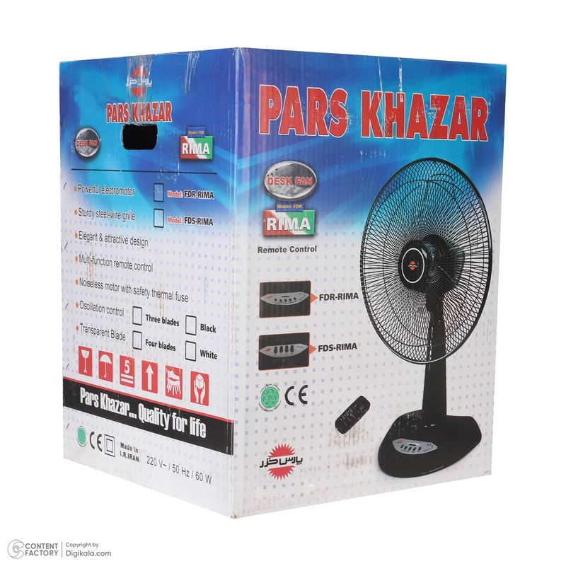پنکه پارس خزر مدل RIMA-FDS کالایی با امکان جابه‌جایی راحت است که از وزن 5.8 کیلوگرمی برخوردار است. این نوع پنکه‌ی رومیزی حجم باددهی و پرتاب باد بالایی در حدود 56 متر مکعب در دقیقه دارد و با وجود چهار پره که بین دو صفحه محافظ مشبک قرار گرفته است امنیت و کارایی مناسبی را به کاربر هدیه می‌کند. کلیدهای تنظیم سرعت این سیستم در سه حالت و به‌صورت لمسی قابل برنامه‌ریزی است و قابلیت تنظیم گردش افقی هم از دیگر مشخصاتی است که می‌تواند به کارایی این دستگاه برای خنک‌کردن محیط‌هایی با ابعاد زیر 100 متر اضافه ‌کند. نوع عملکرد این دستگاه بدون لرزش همراه با تولید صدای کم است و این قابلیت را دارد تا به شکل افقی گردش و محیط را خنک کند. با این حال در کنار تمام این مزایا باید بدانید که پنکه‌ی مدنظر از ریموت کنترل و تایمر برخوردار نیست به همین دلیل هم در مقایسه با رقبای هم تراز خود یک قدم عقب‌تر ایستاده است. این مدل پنکه‌ی خانگی به موتور مجهز به فیوز حرارتی مجهز است و از گواهینامه استاندارد ایمنی محصول و همچنین نشان استاندارد اروپایی CE نیز بهره می‌برد.